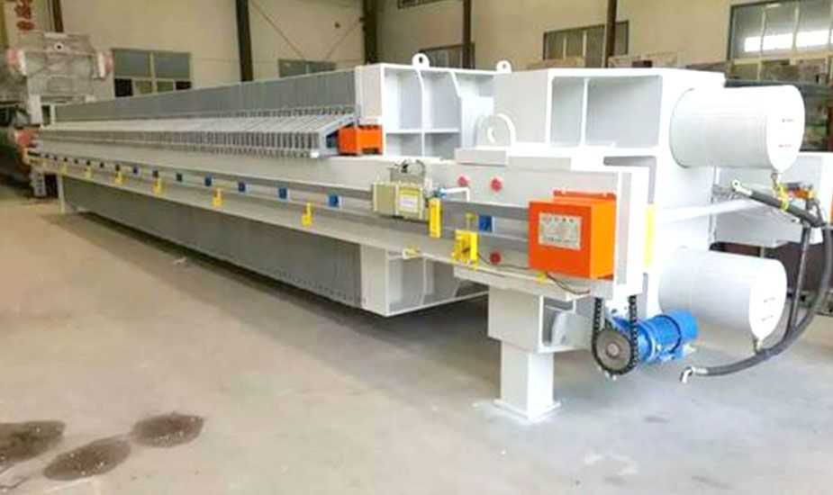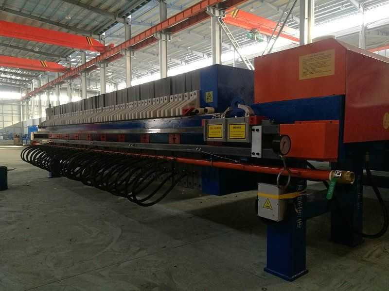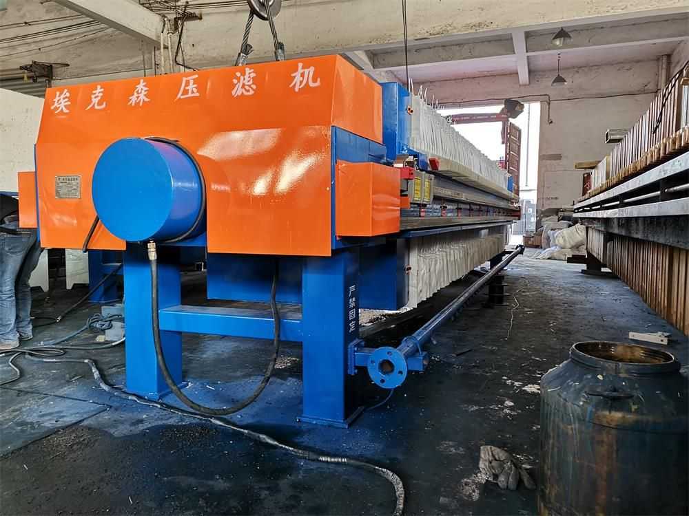 隔膜壓榨壓濾機(jī)是由隔膜板和廂式濾板排列組成濾室,在輸料泵的壓力作用下將料漿輸入濾室,通過過濾介質(zhì)(濾布)將料漿中的固體和液體分離,當(dāng)料漿中的固體形成餅后,再向隔膜通入空氣,對(duì)濾室內(nèi)的固體充分壓榨。